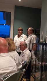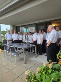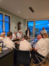 Rückblickend auf seinen 80sten Geburtstag und zur Einweihung seines neuen Zuhause, hat uns Ruedy und Andrea zu einem gemütlichen Abend zu sich eingeladen. Pünktlich trafen (fast) alle ein und nach der Besichtigung der Wohnung durften wir zu Ehren der Gastgeber auf dem Balkon ein paar Lieder singen. Eigentlich sollte das Ständeli im Freien stattfinden, Petrus hatte aber leider kein Einsehen, denn es regnete aus Strömen. Trotzdem wurde uns von diversen Balkons zuapplaudiert. Dem Jubilar wurde ein kleines Geschenk in Form von gutem Weisswein überreicht. Feine hors d'oeuvre-Platten wurden aufgetischt, dazu ein guter Tropfen bevor noch ein Dessert den kulinarischen Teil abrundete. Rita und Eugen begleiteten den Abend mit drei Vorträgen. Der beste Dank an Ruedy und Andrea für diesen wunderbaren Abend. HJ