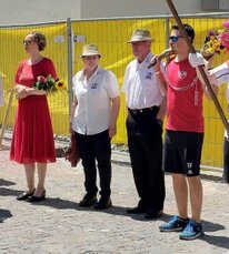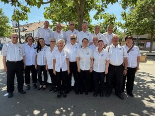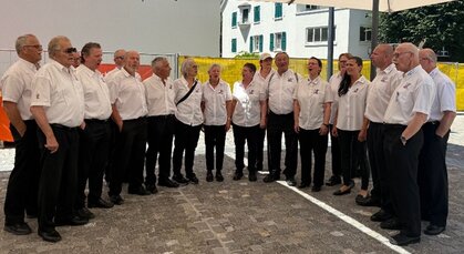 Wir haben uns bei sehr grosser Hitze nicht in Tracht, sondern im Kurzarmhemd auf dem Dorfplatz getroffen. Alle waren anwesend, bis auf Köbi, der heute seinen 70. Geburtstag feiert 🎂. Als der Turnverein mit dem Tram ankam, marschierten wir zum Ernst Feigenwinter-Platz, wo uns die Vereinsfahnen und die Musik herzlich begrüssten. Nach kurzen Berichten der jeweiligen Vereine werden wir zu einem üppigen Apéro eingeladen. Dass auch viele von uns noch länger sitzen geblieben sind, zeigt einmal mehr die gute Kameradschaft!