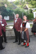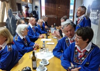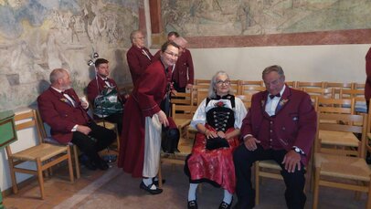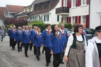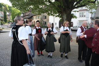 Um 19 Uhr trafen wir uns in der Tracht bei der Kirche St. Arbogast in Muttenz und haben uns dann in einem Raum in der Mittenza bei stickiger Luft eingesungen. Anschliessend begaben wir uns zum Warteraum. Endlich konnten wir in die Kirche einmarschieren und unser Lied «s’Glück im Läbe» zum Besten geben. Also mit dem Aufstellen hapert es noch, aber das Lied ist ziemlich gut gelungen. Im «Beinhaus» neben der Kirche erwarteten wir einen Juror, der uns eine sehr konstruktive Kritik abgegeben hat, so dass wir nun wissen, woran wir noch feilen können.