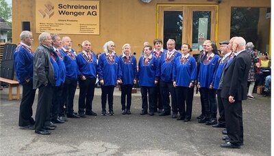 Um 13.15 Uhr machten wir uns auf den Weg zum Gemeindeplatz, wo wir sehnlichst erwartet wurden. Wir stellten uns auf und haben zwischen der Rede vom Bürgerratspräsident Christian Venturini unsere Lieder gesungen. Das Publikum schien begeistert zu sein. Wir teilen uns dann auf, denn einige von uns wollten den Bann mitwandern (1 Std.) und die anderen marschierten direkt zur Bürgerhütte. Dort oben erhielten wir dann Gutscheine für ein Waldfest und ein Getränk, sassen gemütlich beisammen und sangen zwischendurch wieder ein paar Lieder. Ebenfalls befand sich eine Schwyzerörgeli-Formation vor Ort, die das Publikum unterhielt und Rita und Eugen verwöhnte das Publikum mit deren Duett-Liedern!
